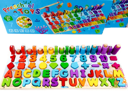 Tablero 6 en 1 de madera de abecedario, números , figuras geométricas y peces magnéticos
