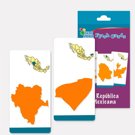 Tarjetas educativas que sirven como apoyo en el aprendizaje de los estados de la República Mexicana y su ubicación espacial.