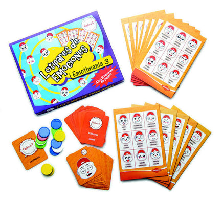 Contiene 12 tablas de lotería, 36 tarjetas con diferentes emociones en español e inglés, 108 fichas y un instructivo con 8 formas de jugar.