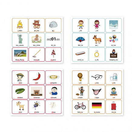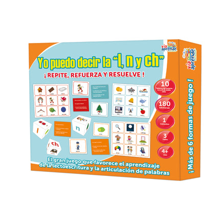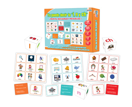 Contiene 10 tableros del fonema l,n y ch de doble vista, 180 adivinanzas, 1 instructivo y 3 dados.