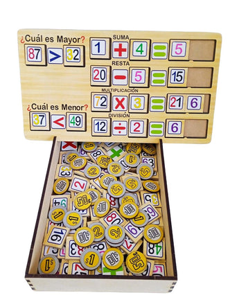Contiene 108 piezas de madera con números del 0 al 100, 35 monedas de madera y 49 billetes didácticos