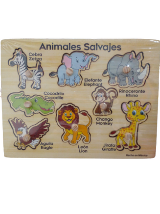 on este rompecabezas de pija, los niños conocerán y aprenderán los animales salvajes en inglés y español de forma divertida.