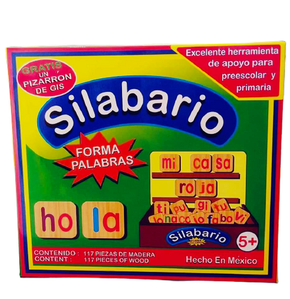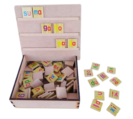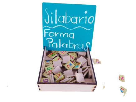 Material madera, la tapa es un pizarrón de gis y del otro lado es la base para colocar las sílabas.