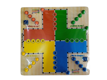 Juego de mesa familiar, contiene 1 tablero de madera, 20 canicas de plástico de 4 diferentes colores y 2 dados.